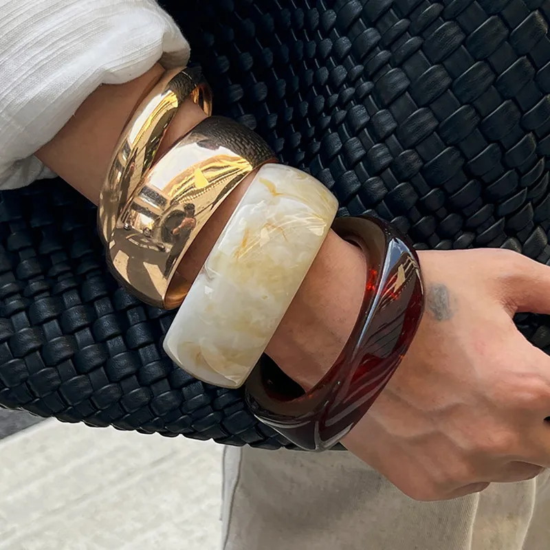 Laissez-vous séduire par nos bijoux inspirés des années 70–80. Fabriqués en acrylique de haute qualité aux couleurs unies et éclatantes, ils apportent une touche vintage tout en restant modernes. Chaque pièce est magnifiée par un jonc rigide plaqué en or 18 K, pour un contraste sophistiqué et chic.