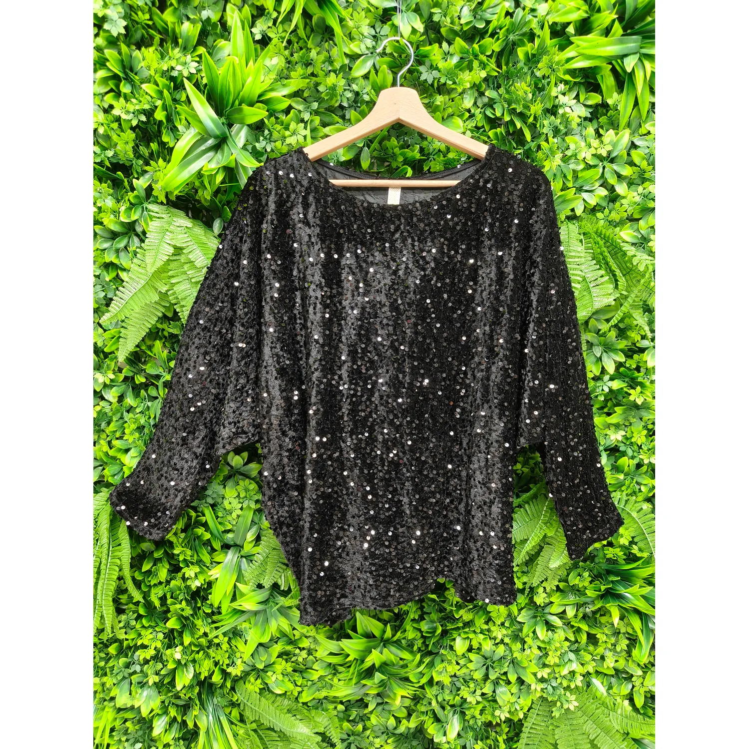 Laissez-vous séduire par ce superbe haut noir entièrement recouvert de sequins, parfait pour illuminer toutes vos tenues ! À la fois chic et confortable, il offre une coupe ample qui convient à toutes les morphologies tout en apportant une allure festive irrésistible.