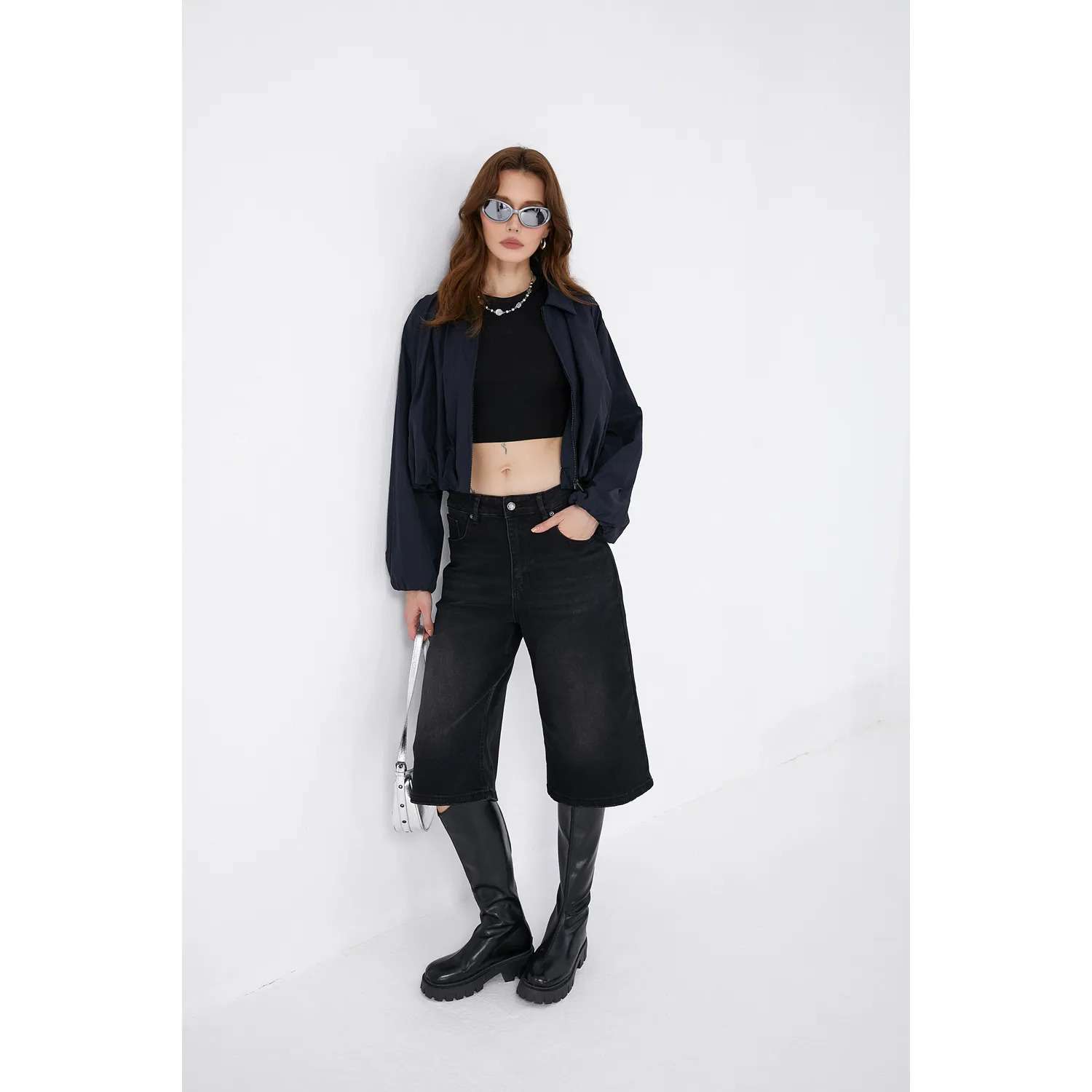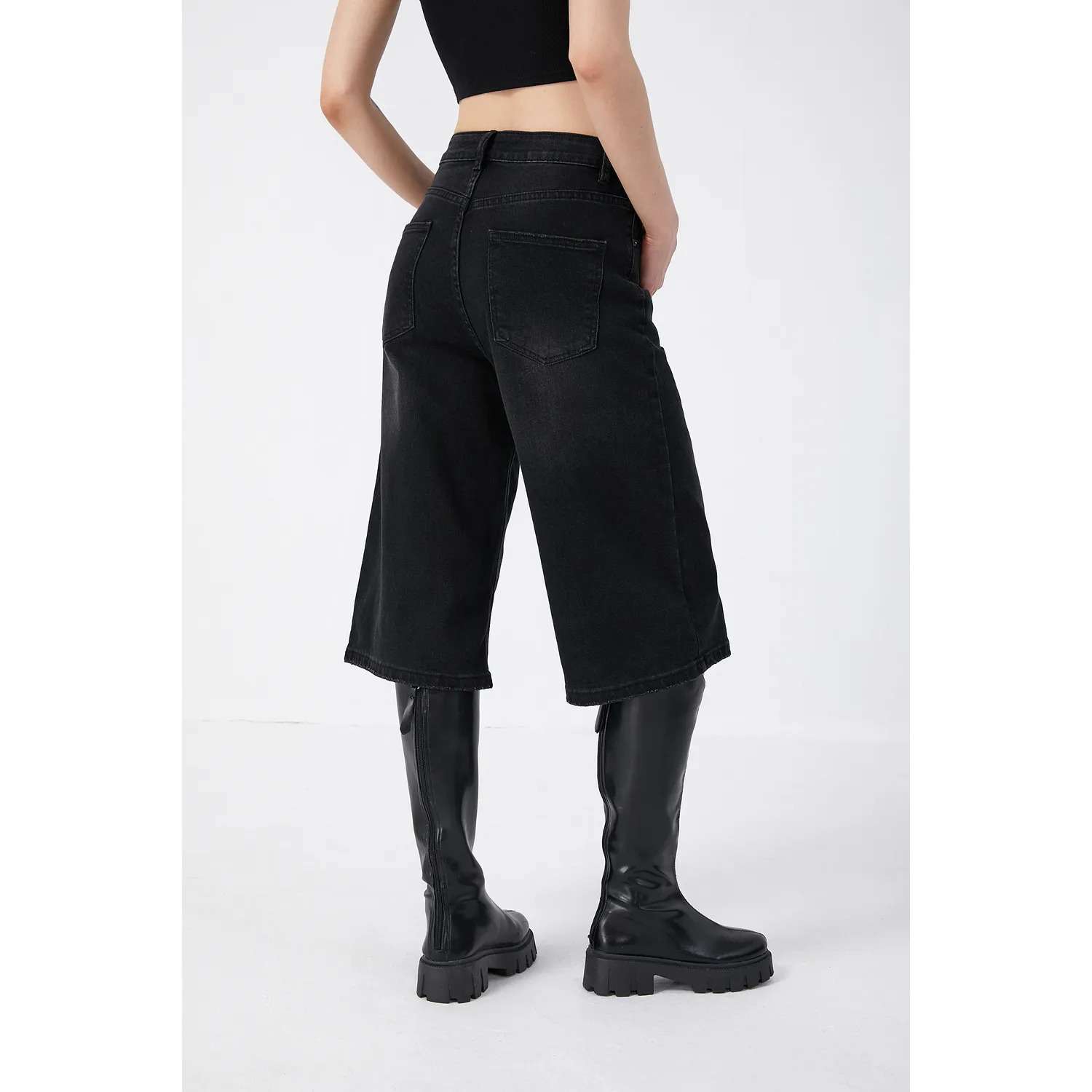 Associé à une paire de bottes, le bermuda en jean noir crée un contraste saisissant :