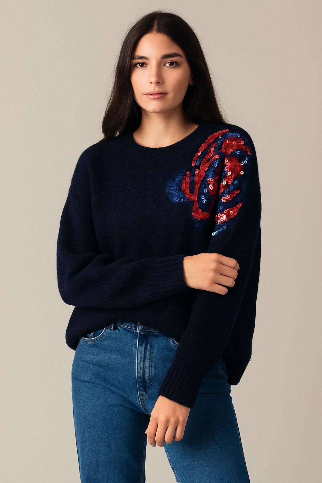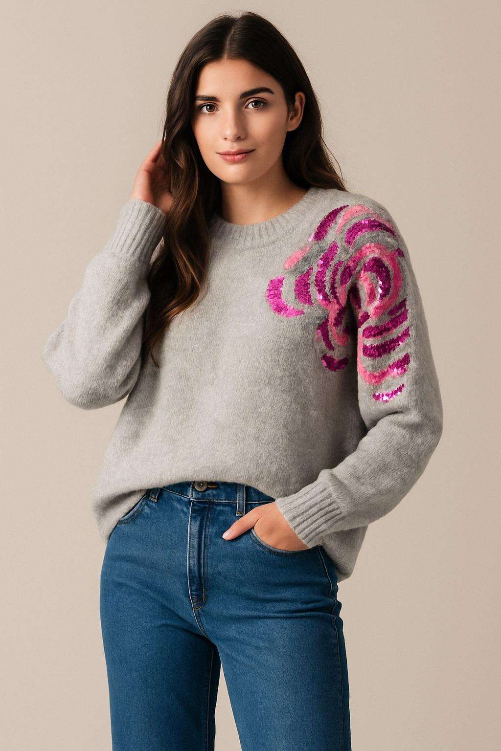 Pull à motif fleur en sequins – Élégance et originalité. Affirmez votre style avec ce pull crème au design unique, orné d’une grande fleur en sequins sur l’épaule. Confectionné dans une maille douce et confortable, ce modèle allie chaleur et élégance. La fleur, composée de sequins roses, fuchsia et dorés, apporte une touche lumineuse et audacieuse qui capte instantanément le regard. Sa coupe légèrement oversize et ses finitions côtelées aux poignets et à la base en font une pièce à la fois tendance et facile à porter. Détails produit : Couleur : crème Motif : fleur en sequins cousus (rose, fuchsia, doré) sur l’épaule Coupe : droite, légèrement ample Encolure : ronde Matière : maille douce Manches longues Idéal pour rehausser un jean classique ou twister un look chic, ce pull est un véritable coup de cœur de saison.