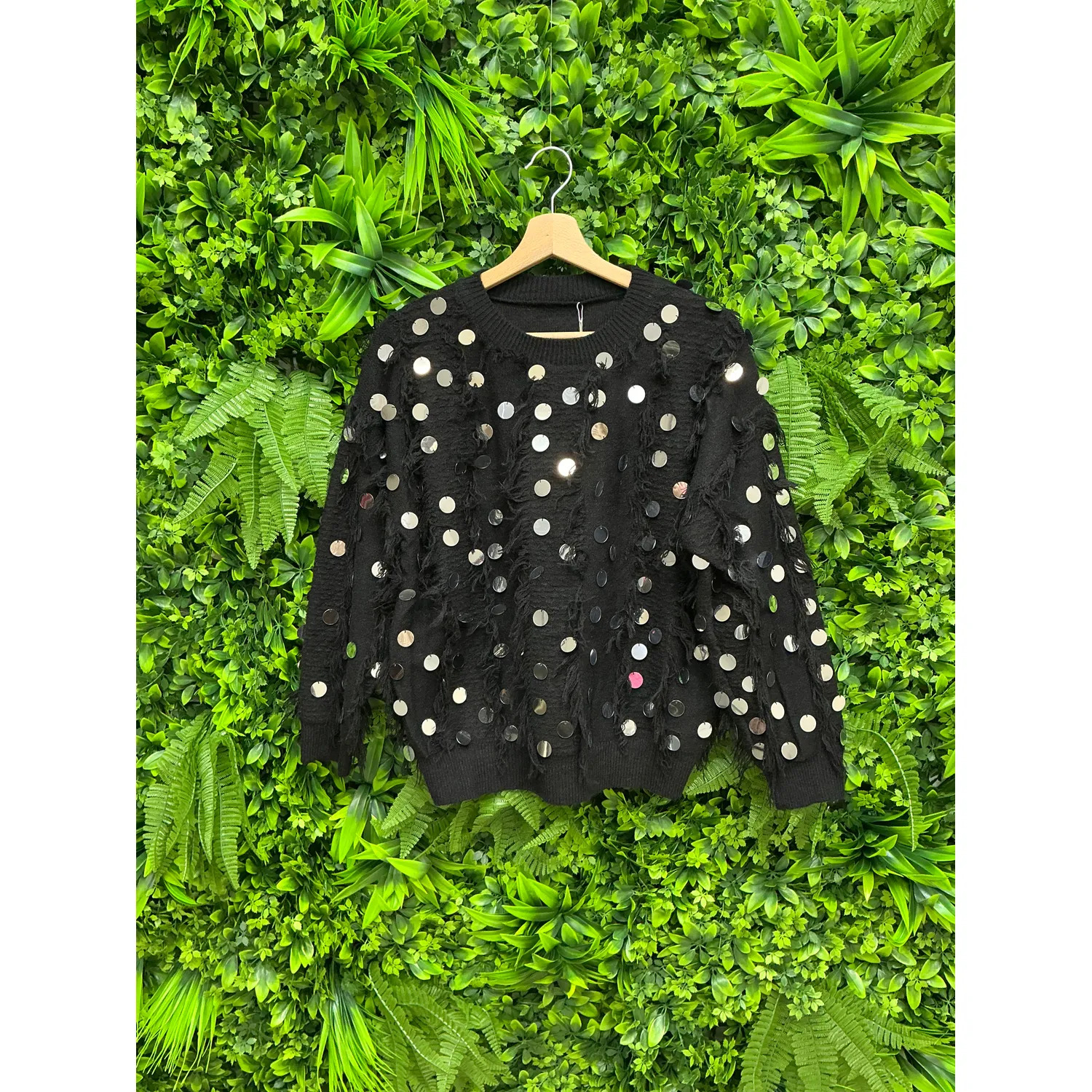 Apportez une touche d’éclat à votre tenue avec ce superbe pull noir orné de sequins ronds. Chic, moderne et confortable, il est parfait pour illuminer vos looks d’hiver, vos soirées ou vos événements festifs.