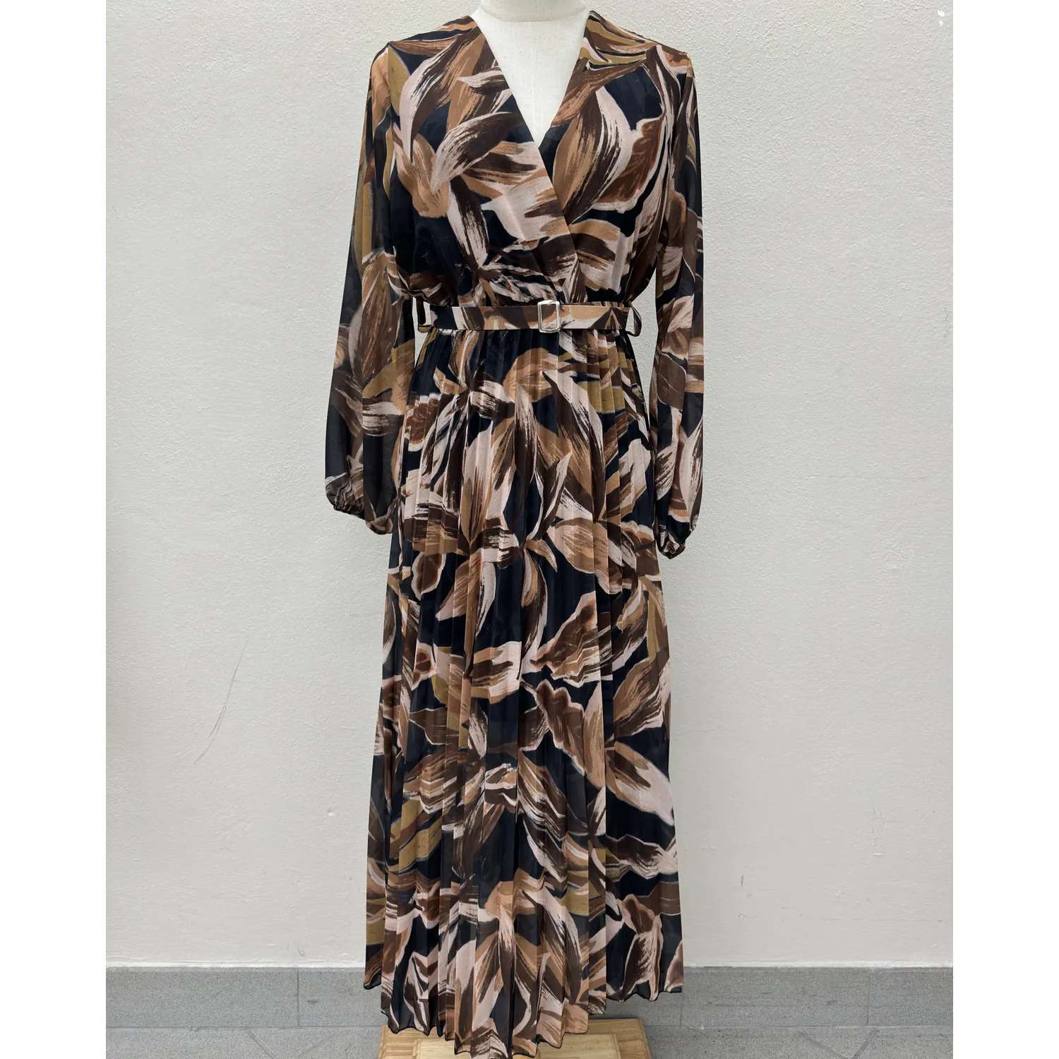 Plongez dans la douceur de saison avec notre robe longue imprimée aux teintes chaudes de l’automne.