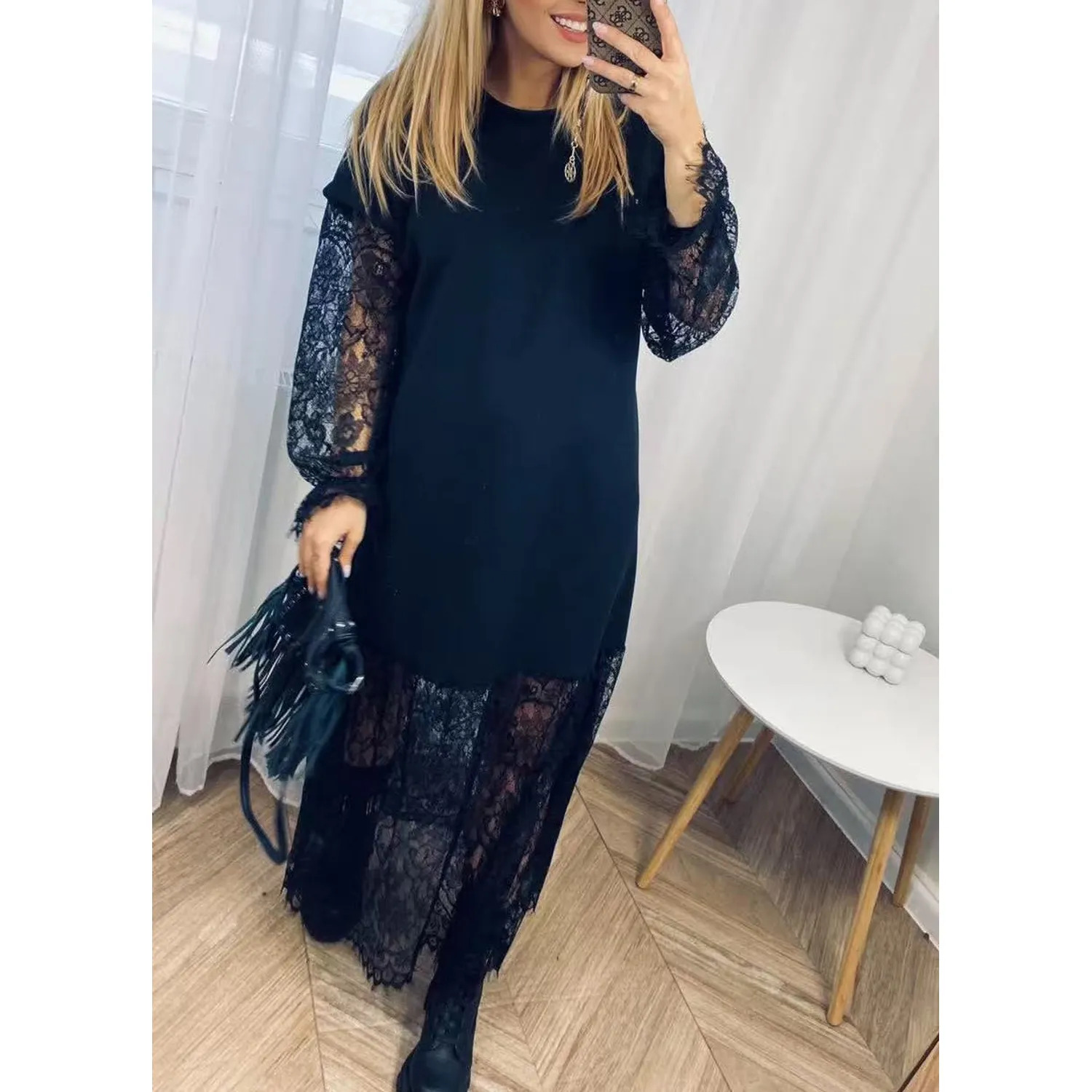 Sublimez votre silhouette avec cette magnifique robe longue noire, alliant sobriété moderne et détails féminins en dentelle. Sa coupe fluide et son jeu de transparence en bas et sur les manches en font une pièce à la fois chic et raffinée, parfaite pour toutes vos occasions.